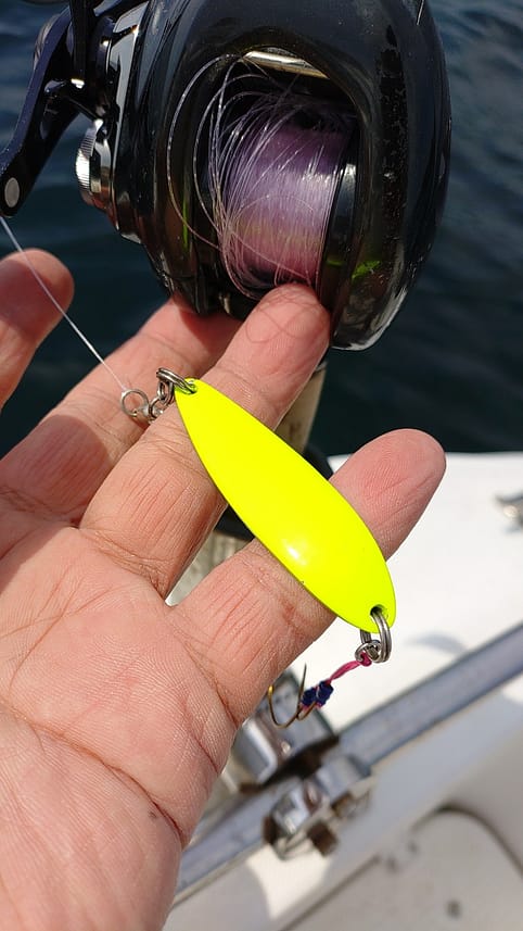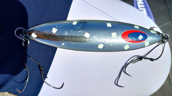 〇 2025年3月29日(土)「延岡沖なぶら発生」 根魚を釣っていたら、突如青物のなぶらが発生しました。 当然、なぶら打ちするタックルは持ってません。 たまたま持っていた、サクラマス用のスプーンを投げると、 水面付近でハマチが喰ってきます。(^^) ナイロン16lbだと、びよーんってラインが伸びるので、 変な感触です。 写真撮るのも忘れて、釣ってはリリース、釣ってはリリース 写真は、バックラッシュしたアンタレスとチヌークです。 結局、なぶらが完全に消えるまで、7匹のハマチが遊んでくれました。 ● タックル ロッド:シマノ カーディフ リール:23アンタレスDCMD ライン:ナイロン16lb(100m) ルアー:ダイワ チヌーク25g
